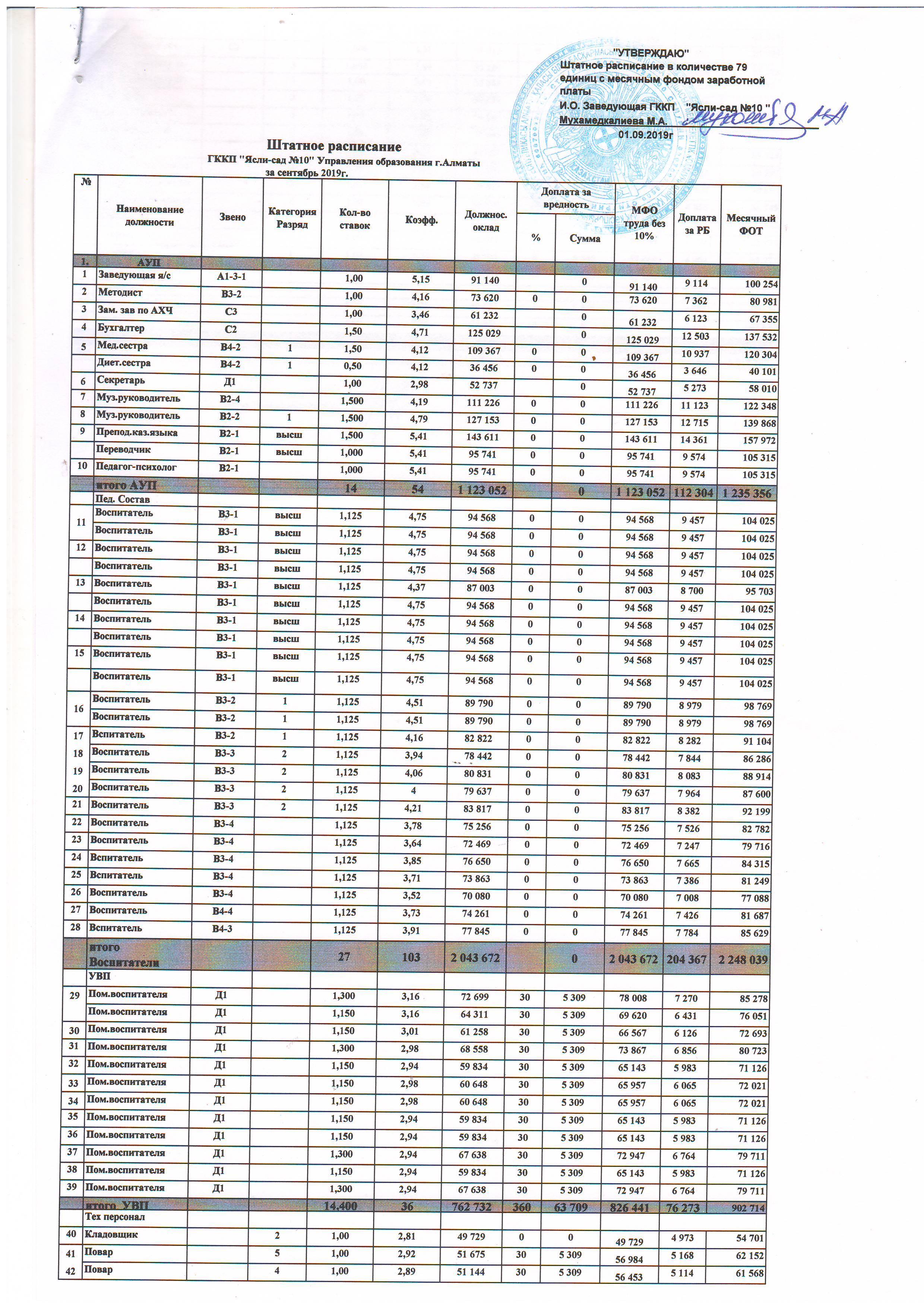 01 сентябрь 2019 штатное расписание